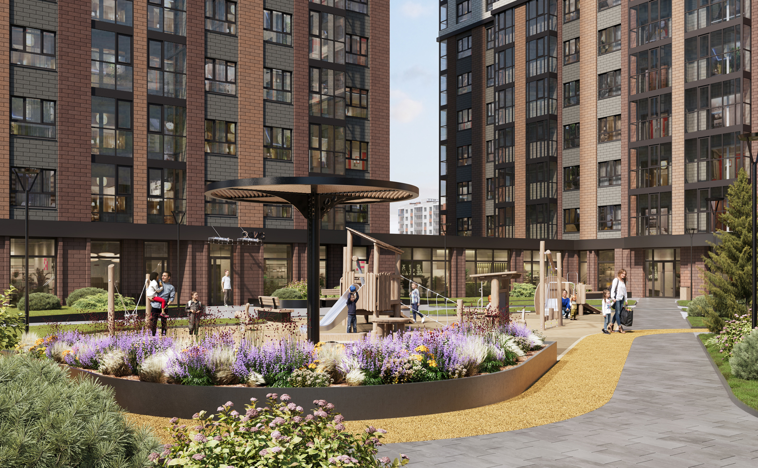 Здесь не будет заборов и машин — только свобода, пешеходные дорожки, фонтаны и пространство. Внутри квартала — современные детские площадки, зоны для йоги, зелёные кабинеты для удалённой работы и даже своя оранжерея. Всё, чтобы не просто жить, а наслаждаться временем дома.