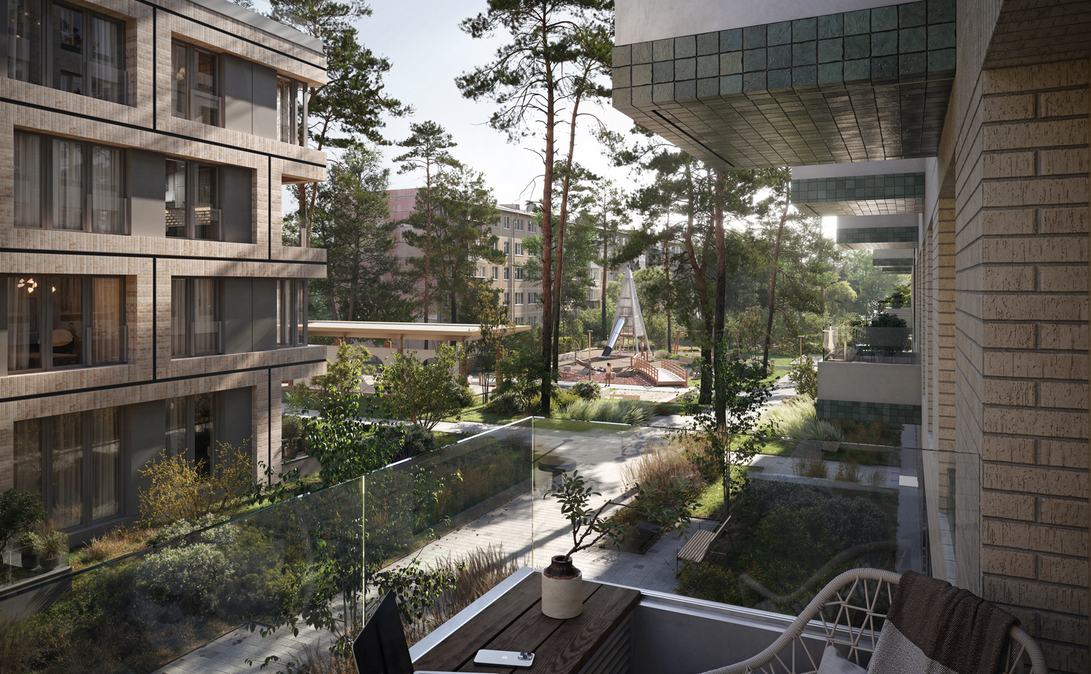 Архитектура комплекса продумана до деталей: по периметру — 10-этажные дома, внутри — разновысотные корпуса (6–14–18 этажей), и при этом деревья всё равно будут выше. На первых этажах — коммерция, на последних — пентхаусы с террасами и видом на лес.