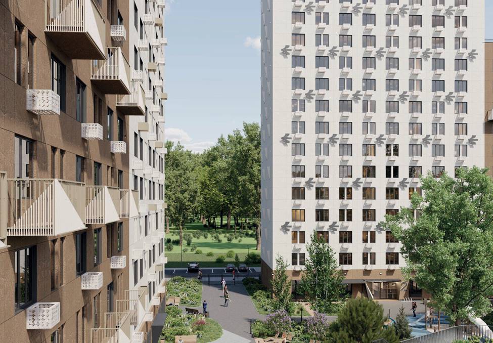 Во дворах комплекса организованы закрытые озелененные пространства с игровыми площадками для детей всех возрастов. Стилобаты отведены под коммерческие помещения, вдоль квартала проходит пешеходная аллея и велодорожка. Для жителей предусмотрены общедомовые кладовые свободного пользования.