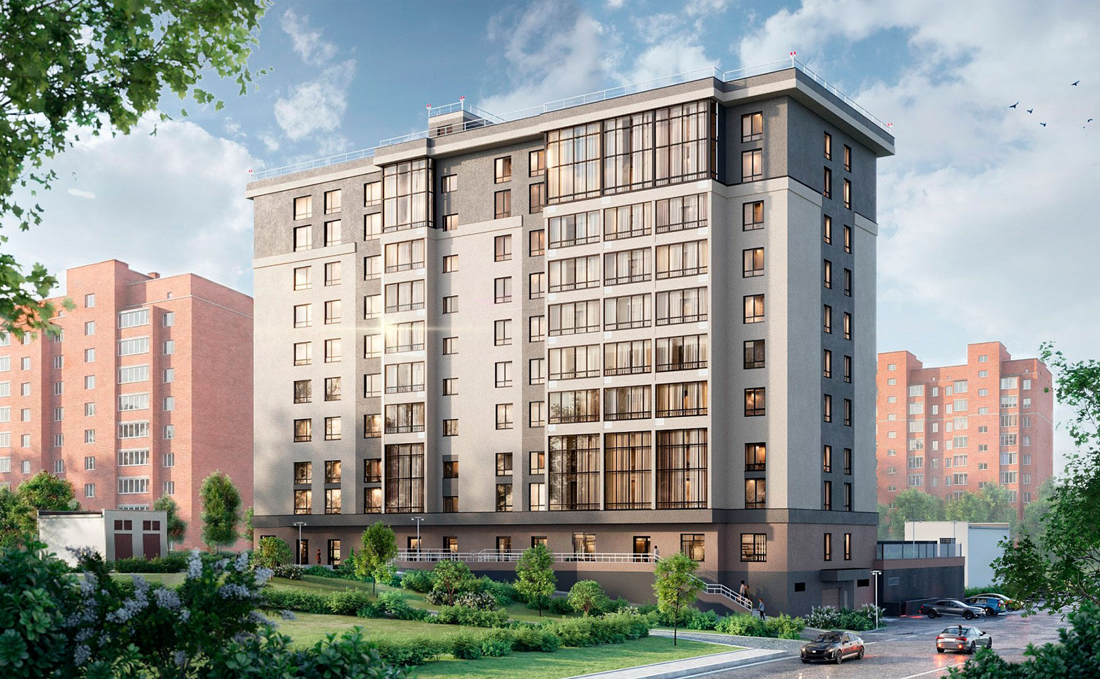 Территория комплекса благоустроена, для жителей оборудованы детские и спортивные площадки. Для владельцев авто организован подземный паркинг. На первом этаже здания размещены коммерческие помещения.