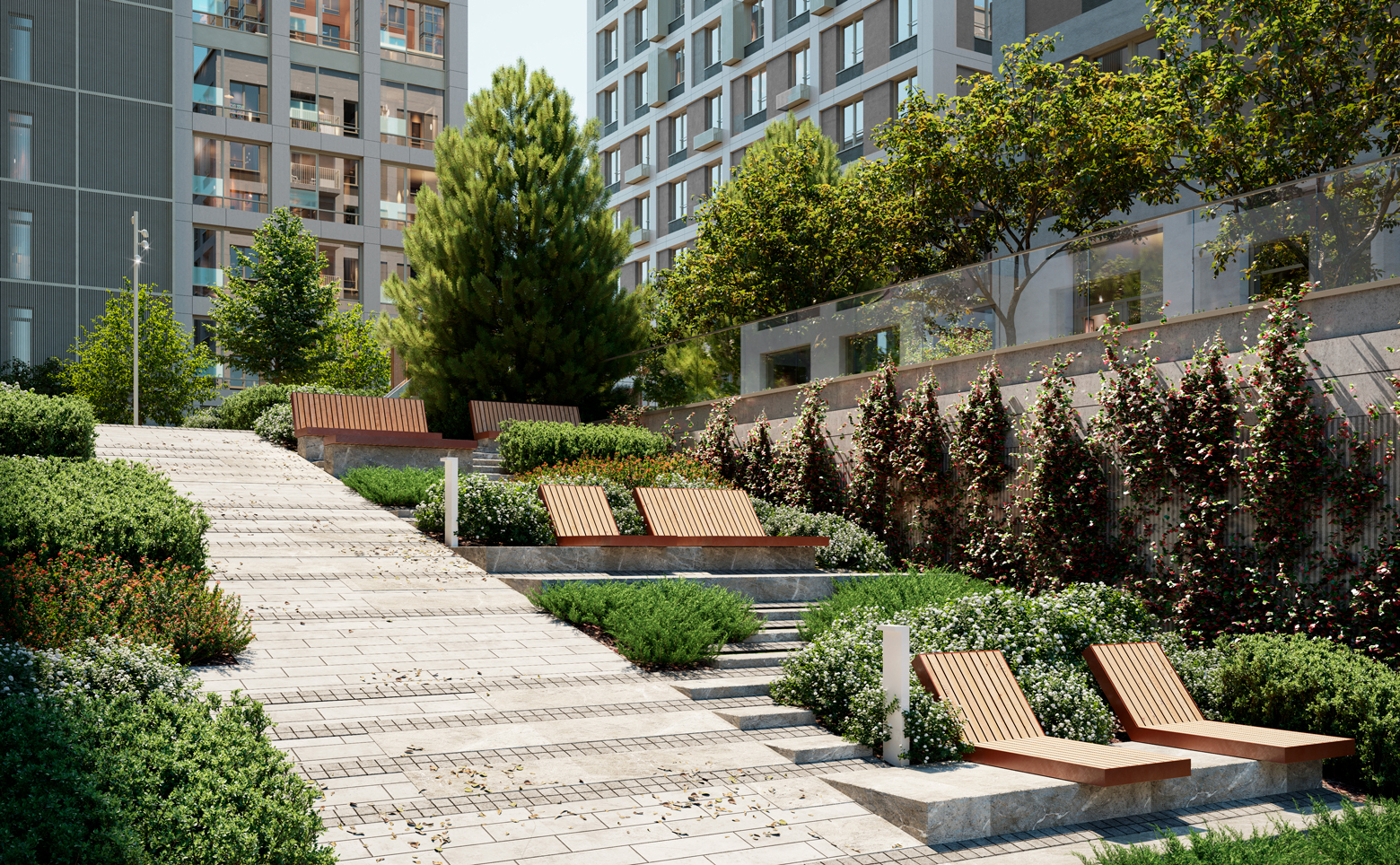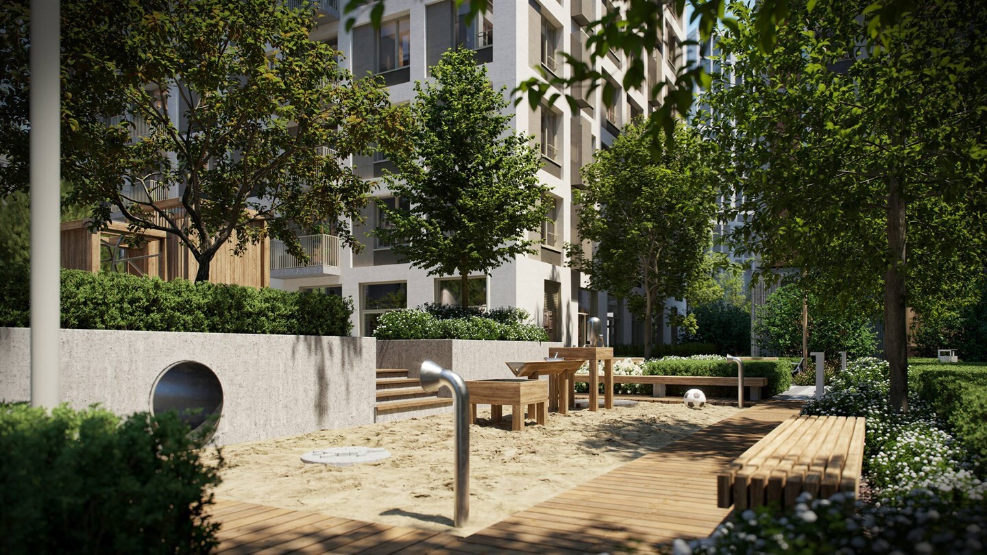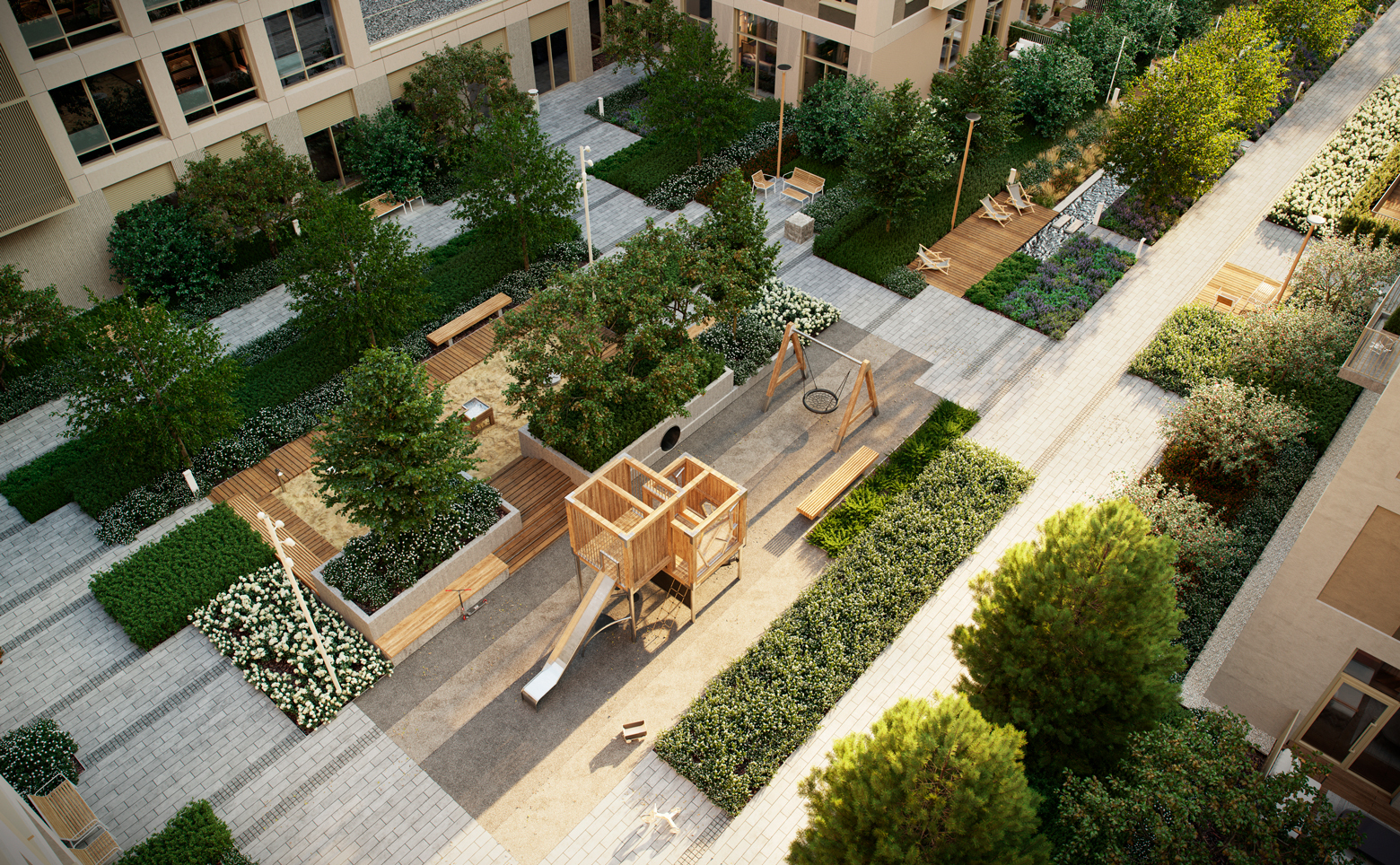 Дворы организованы на стилобатах домов, за счёт этого они приподнялись над улицей, стали ещё более приватными и безопасными для жителей. Дворы и общественные пространства спроектировали таким образом, чтобы они были интересны и удобны для юных жителей всех возрастов. Здесь есть детская площадка, для разных детских игр, большая беседка, зоны, где можно уединиться, ступенчатый водопад «Гранитный карьер» и огород.