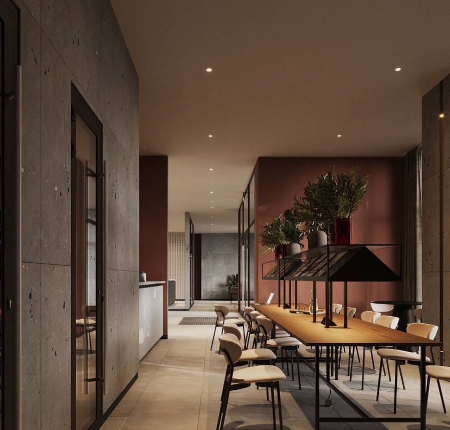 Главное лобби с зоной ресепшн, мягкими зонами и переговорными. Контрастный и ритмичный интерьер лобби вдохновлен цветовой гаммой и атмосферой города. В интерьере используются материалы имитирующие камень, бетон, глину. Цветовая гамма создает теплую и энергичную атмосферу. Ритмичные композиции из каменной настенной плитки гармонично перекликаются с монументальными, стенами в керамограните имитирующем бетон, разбавляются зеркалами и терракотовыми стенами, которые и создают ассоциации с городом. Минималистичные почтовые ящики и встроенные светильники так же задают свой ритм, вытягивая и разделяя помещения на своеобразные кварталы, а растения, мебель, предметы искусства и мягкий свет добавляют интерьеру ощущение домашнего уюта.