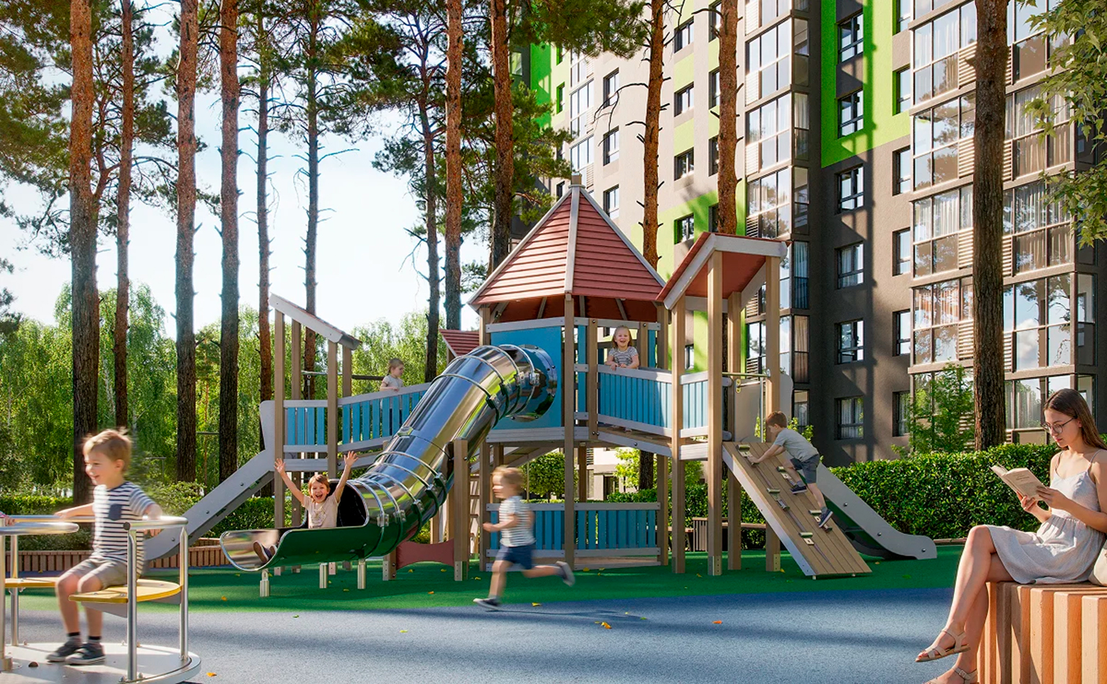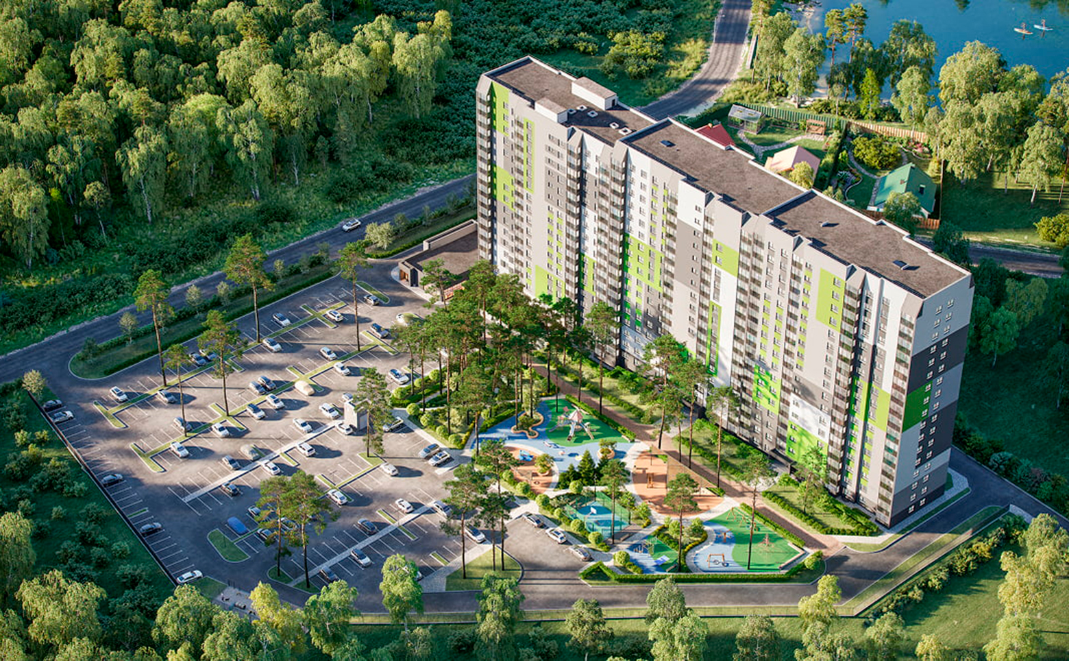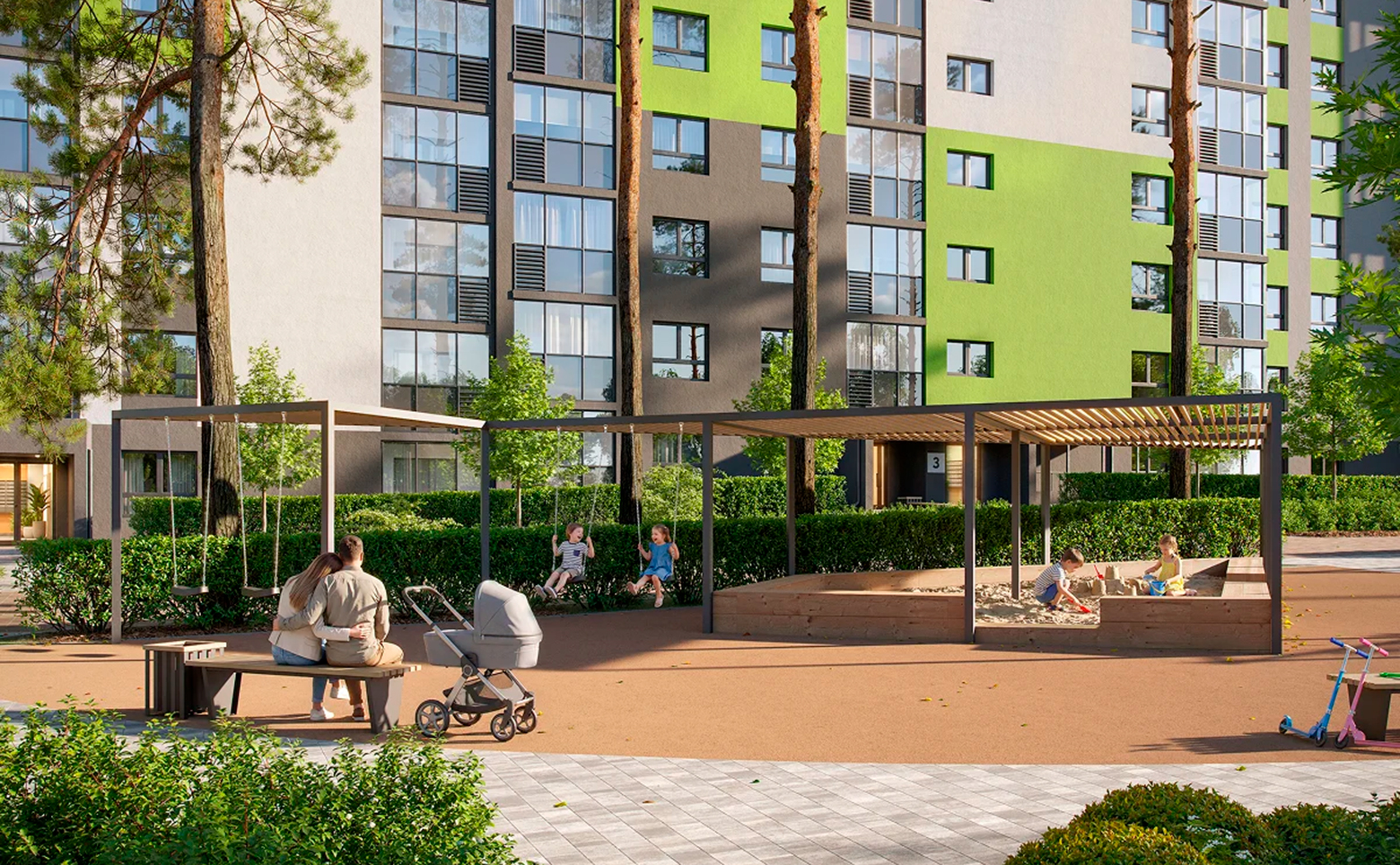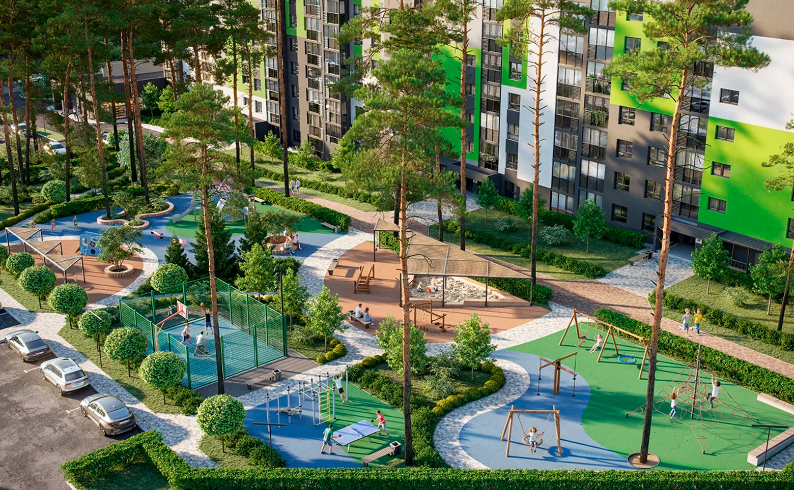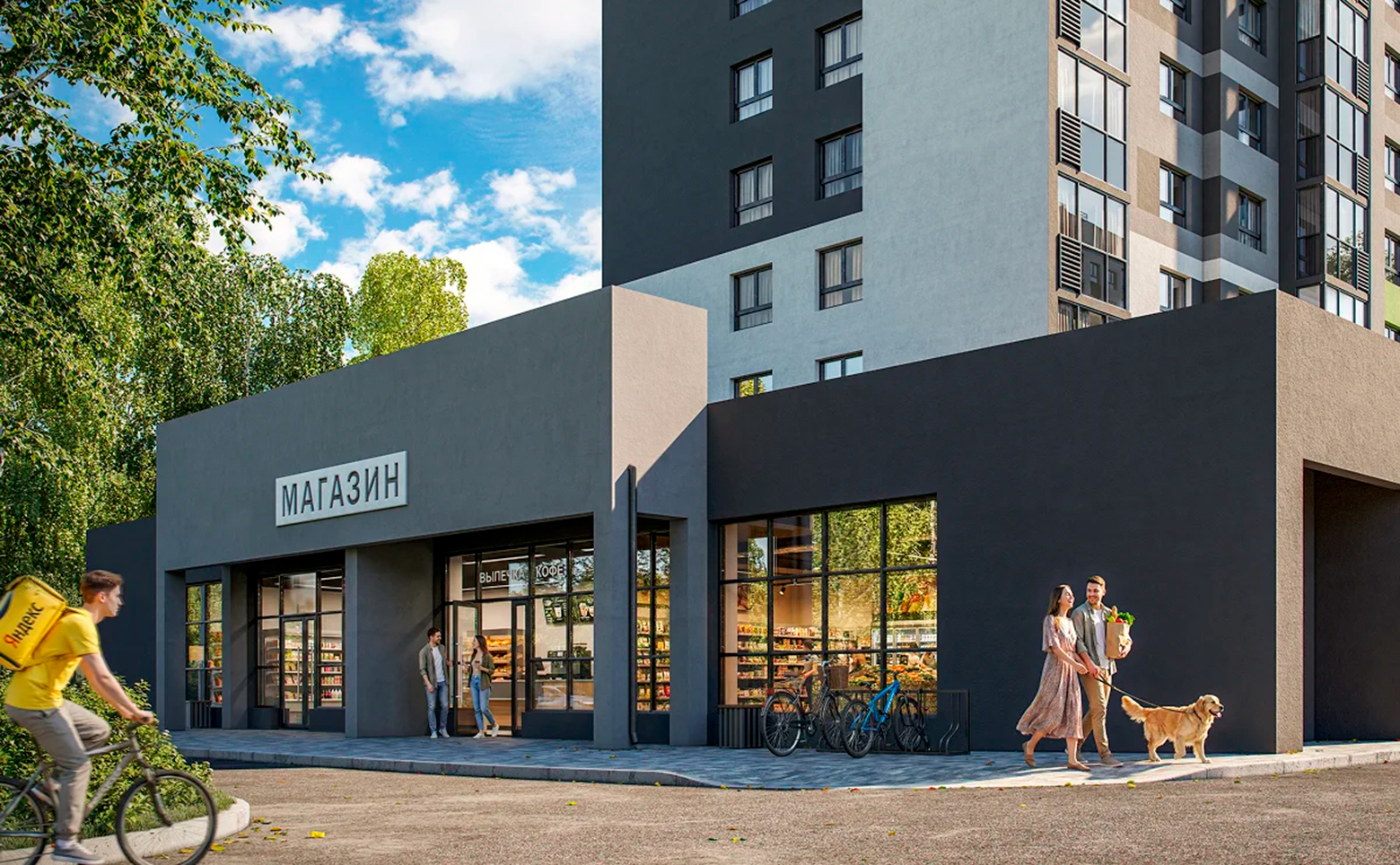 Территория комплекса закрыта от посторонних и благоустроена: для жителей оборудованы спортивные и детские площадки. Также обустроены понижающие площадки для удобства передвижения. Первый этаж здания отведен под коммерческие помещения. Для владельцев авто организована стоянка.