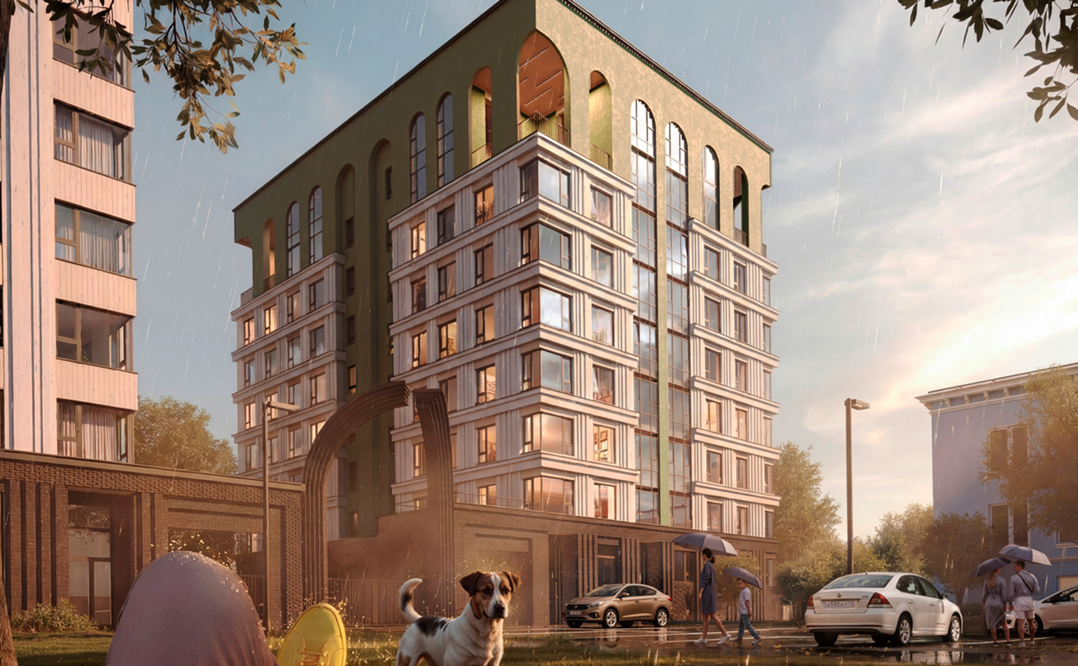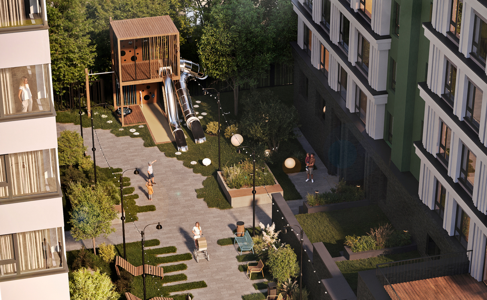 Территория комплекса благоустроена и озеленена. Для жителей обустроены детская площадка и зоны отдыха. Двор закрыт от посторонних. На первых этажах зданий предусмотрены коммерческие помещения. Для владельцев автомобилей оборудован подземный паркинг, также предусмотрена гостевая стоянка.
